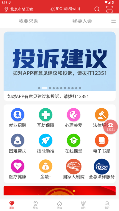 北京工会12351最新版本app是一款专为北京职工量身打造的优质生活服务类软件,将线下工会服务延伸至线上,让职工轻松获取周边活动与适配服务,全方位满足北京职工在工作、生活、学习等多维度的需求,是职工生活的好帮手。