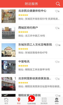 2、切换到【附近】页面之后,我们还能看到附近的各类商户服务及其详细地址。
