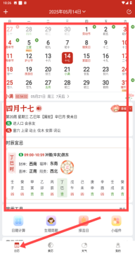 2、随记万年历黄历页面,显示2025年5月14日黄历详情,包含五行、冲煞等传统信息及当日运势。