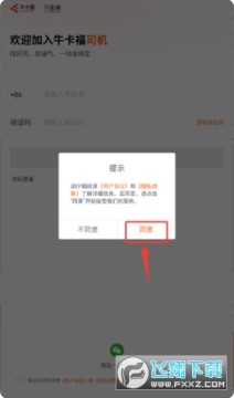1、打开万金油司机软件,在 “提示” 弹窗中,点击 “同意”,进入登录界面。
