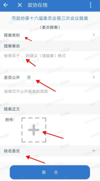 选择【提案类别】→输入【提案案由】→选择【是否公开】,不公开需要填写不公开的理由→选择【提案正文】,提案正文附件必须以.doc、.docx.、.wps 的格式提交→若是联名提案,选择需要共同提案的联名人,如果需要短信通知联名人,请点击短信通知按钮→信息填写后点击【提交】按钮进行提交