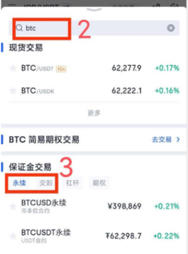4,点击左上角币对,在搜索框输入币种,选择相应币对的合约类型和保证金类型。
