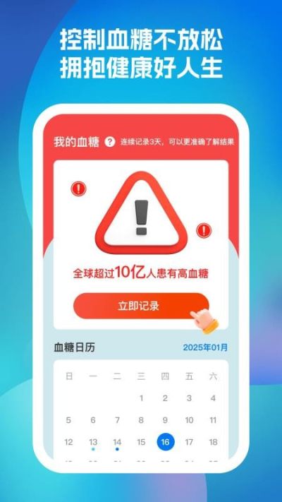 3、进入去的血糖记录点击页面中央"立即记录"按钮,系统将跳转至详细的数据录入表单界面。