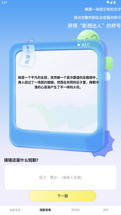 2、在短剧宝库页面,用户能够依据一段剧情来猜对应的短剧,只要输入正确的短剧名称,就能进入下一题继续挑战。