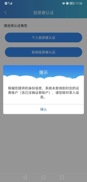 2、进行个人投资者认证。如果显示“根据您提供的身份信息,系统未查询到对应的证券账户(含已注销证券账户),请您核对录入信息”,若输入信息无误,则表示您本人尚未开通证券账户。