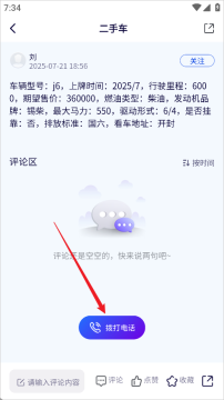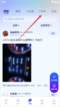 3、在这里有非常多的卡友会发布自己的二手车,你可以选择自己感兴趣的进入,或者需要卖车的话也可以点击下方的卖车按钮