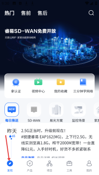 1、发现页面有热门、售前等分类推睿易SDWAN免费开放,设拿认证、视频中心等功能入口,还有每日推送的产品资讯。