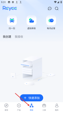 3、项目页面有扫一扫、虚拟体验等功能,可管理我创建我接收的项目,提供快速添加设备选项,助力项目操作。