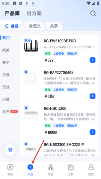 2、产品页面展示产品库,含家用路由器RGEW5100BEPRO等多款锐捷睿易产品,标注价格、新品及保修信息方便查看选购。