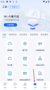 4、工具页面能连接WiFi有WiFi看干扰等工具,涵盖测网速、出方案等多种功能,还分网络检测、安装调试等类别。