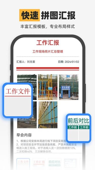 拍照水印图片灵活拼图,丰富拼图模板编辑,一键分享工作群和项目组,完成高效水印打卡,更好反馈现场真实情况。