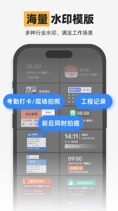 丰富的相机水印模板,满足日常考勤定位打卡,工程记录水印相机、现场拍照,工作时间记录、外勤工作拍照等需求。