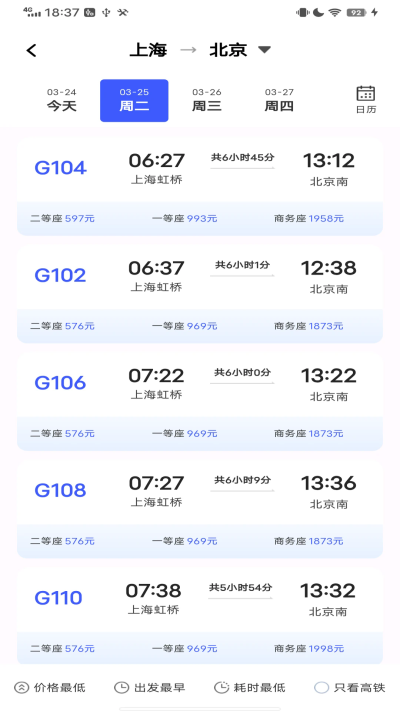 在车次列表页面,可以筛选车次类型(如高铁、动车、普快等)和出发时间,快速找到适合的班次。