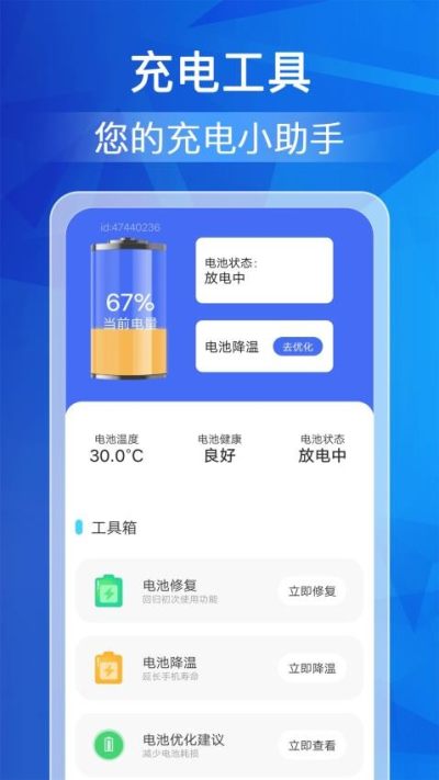 该应用提供全面的电池工具箱服务,涵盖电量检测、健康评估、充电优化等功能。强调数据精准性与操作简便性,适配主流安卓设备,满足用户从基础监测到深度维护的全场景需求。