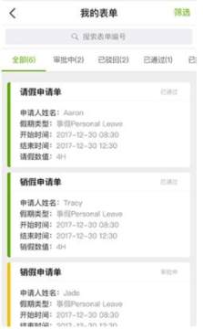所有请假、出差、调休等申请统一归档,状态清晰可查。