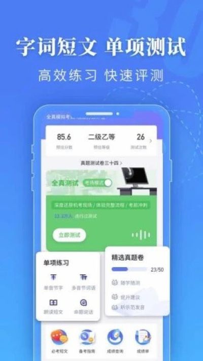普通话测试app功能,纠正发音巩固练习,提高普通话学习效率。全真试题,ai智能语音技术模拟正式普通话考试,为实地参加普通话水平测试打好基础。