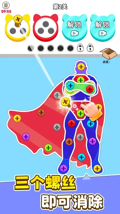需将螺丝放入对应颜色收纳盒完成消除,否则空间不足将阻碍进程。