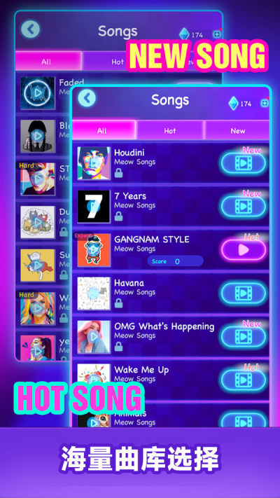 - 小心不要错过一首歌中的任何图块! 游戏围绕著钢琴图块机制展开,其中时机和节奏是成功的关键。