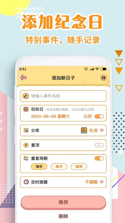 自定分类如:工作、生活、节日、纪念日等。