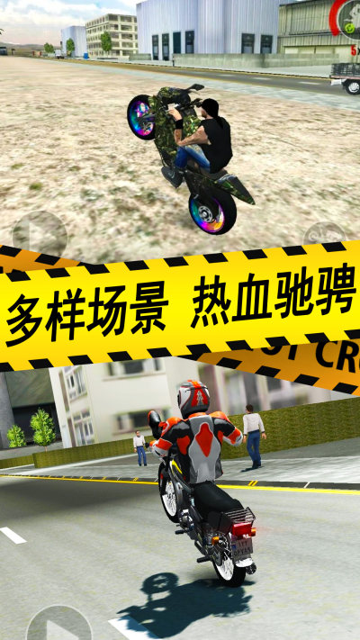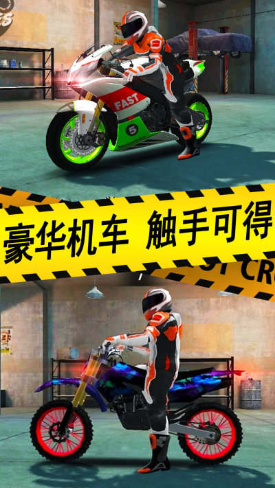 从普通摩托起步,通过任务奖励解锁哈雷、越野、仿赛等豪华机车,并支持一键改装外观、性能,打造专属座驾。