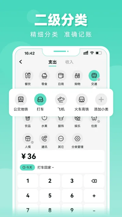 2、多级分类管理:支持一级大类(如交通)细分为子类(地铁公交、打车等),细化消费追踪。