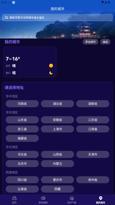 5、点击“我的城市”可添加或编辑关注城市,快速切换不同城市查看对应的天气情况。