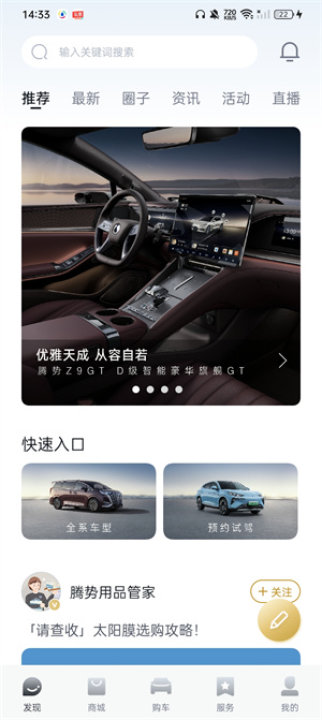 1、打开腾势汽车app,点击发现专区,拥有相应的推荐,还有很多的资讯活动。