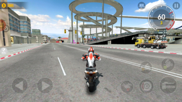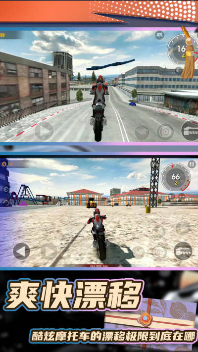 创新采用左手虚拟摇杆/重力感应控制方向 + 右手按键操作加速/刹车/特技,兼顾精准与爽快,还原真实摩托操控逻辑。