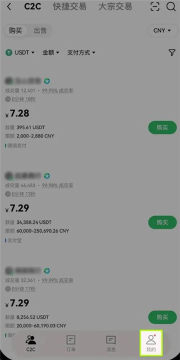 1,打开Ok交易所App,点击【C2C买币】-右下角【我的】图标-【收款账号管理】。
