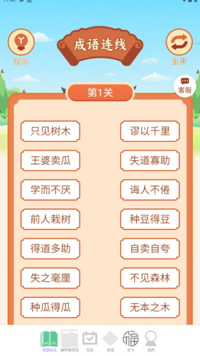 1、打开游戏后就可以开始闯关了,将相关成语进行连线。