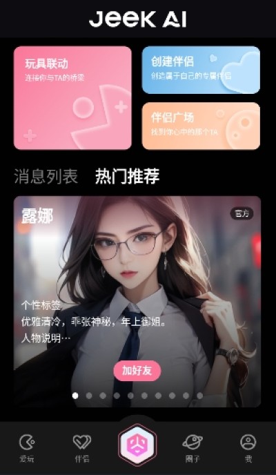 JeekAI极爱也叫JeekAI,由深圳市极爱人工智能科技有限公司官方推出,将ai聊天与玩具连接结合在一起,带去了更逼真更沉浸的虚拟互动平台。软件内置NLP模型,有着仿真拟人对话体验,覆盖的ai角色与故事类型丰富,像恋爱、悬疑、穿越、职场等类型应有尽有,还提供了开放剧情自定义功能,大家能在互动过程中更改人设与故事剧情,完全按自己的喜好和ai对话。