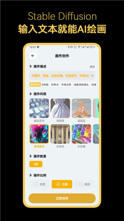 1、文本生成图像(文生图):输入文字提示词,软件基于AI模型生成符合描述的图像,支持卡通、写实、油画等多种风格和不同主题创作