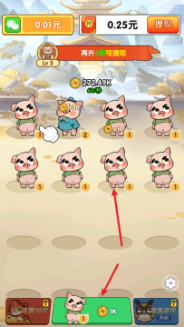 等级金币循环机制:小猪等级越高,产出的金币数量越多;玩家可使用金币购买各类小猪,形成 “合成升级 — 金币增多 — 购买新猪” 的循环,助力持续推进游戏。