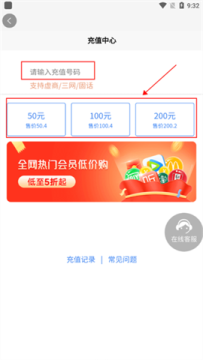 2、在界面上方输入需要充值的手机号码,选择充值金额。