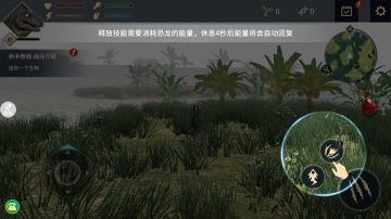 1、创建好游戏存档后,进入恐龙岛沙盒进化游戏,开启新手教学模式,左侧的虚拟摇杆可以操作恐龙移动,右侧下方则为攻击按钮,在攻击按钮的左上方是技能,释放技能需要消耗恐龙能量,尝试休息后能量会自动恢复。