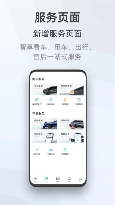 1、一站式服务页面:整合看车、用车、出行及售后,提供全方位护航,让用车生活快乐无忧。