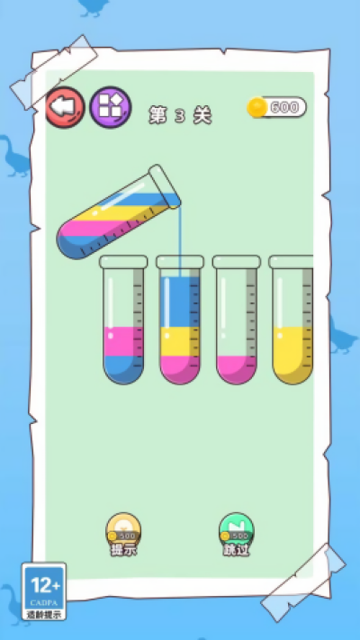 挑战水排序的过程中,需区分这些液体的颜色,之后再利用逻辑关系。