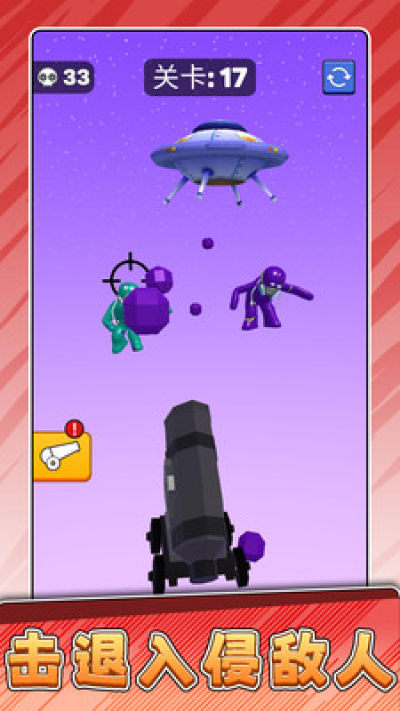 1、在指定关卡中,操控炮台发射弹丸击退入侵的敌人,保护场景内目标,成功抵御所有敌人即可通关。
