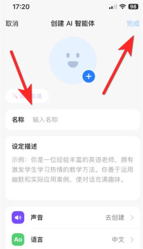4、输入名称后,点击右上角【完成】即可创建AI智能体。