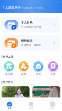3、软件首页提供了个人计税和退税指南入口可点击使用、查看。
