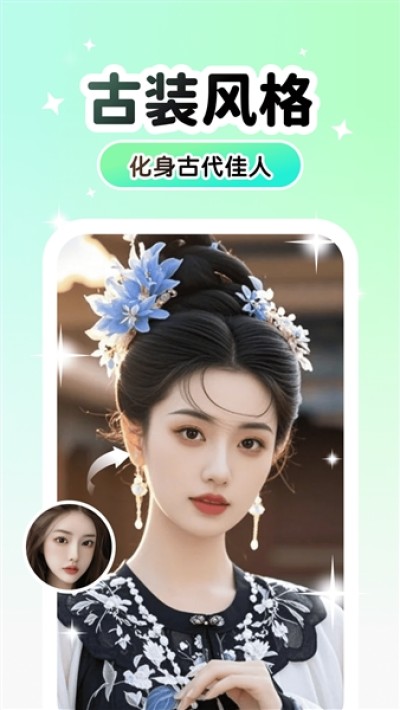 人工智能人像识别:采用先进的人工智能技术来识别人像,并提供一键生成古装造型与背景的功能,为用户提供完整的古风视觉体验。
