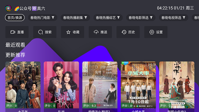 采用 横向分类导航 + 纵向瀑布流海报墙 设计,内容一目了然。只需方向键滑动,即可快速选片、播放,告别复杂菜单。
