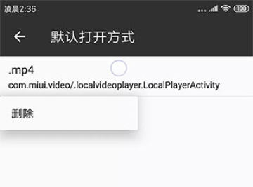 进入管理界面后长按指定类型并点击删除,就可以取消掉对mp4文件的打开方式设置。