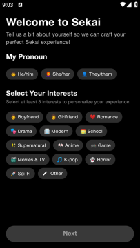 1.在本站内下载安装并进入软件,选择自己的性别和至少3项兴趣类型,完成后点击“Next”。