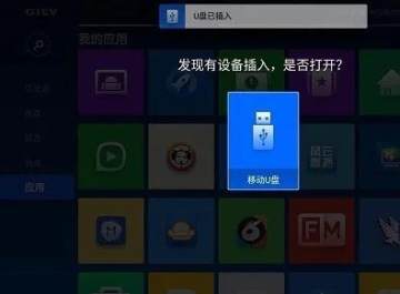 4、下载到移动设备后,将移动设备插入需要安装应用的电视USB口上,此时电视会弹出【打开移动设备】的页面。