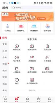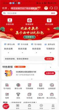 话费充值、联通智家、积分兑换、特色套餐、号卡激活、携号入网、京东、5G专区等特色功能。