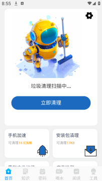 2、进入首页可以看到丰富的功能,点击下方的【立即清理】。