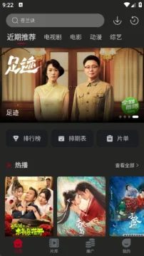 首页设有近期推荐、电视剧、电影、动漫、综艺等版块,其中推荐版块包含排行榜、排期表与片单内容。
