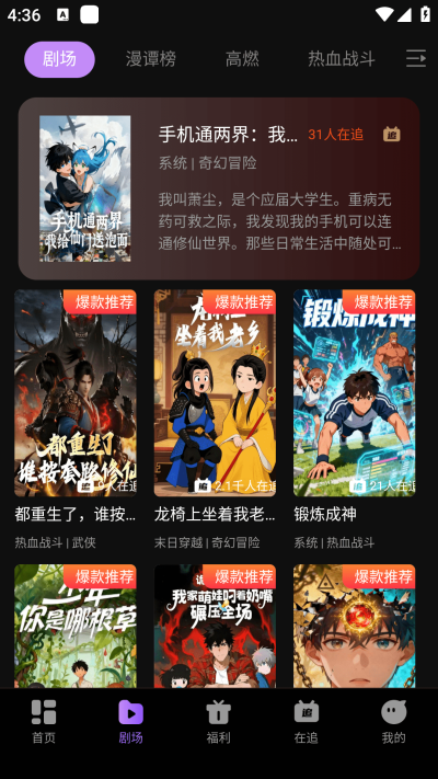 2、在剧场页面提供各种精彩的漫剧,还有漫谭榜、高燃、热血战斗、奇幻冒险等不同的分类;