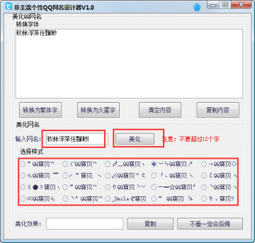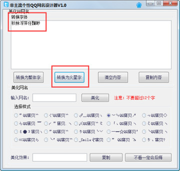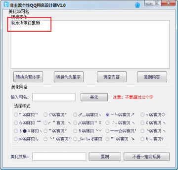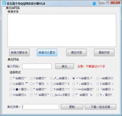 这年头,谁还能没有个QQ呢?QQ昵称千千万,但要设计个有个性的QQ网名,就要用到则还款非主流个性QQ网名设计器了,可以快速将您输入的网名转换成繁体字或火星文,还有网名美化功能,可以将你输入的名字中添加各种特殊符号,帮助您设计出既美观又个性的网名。